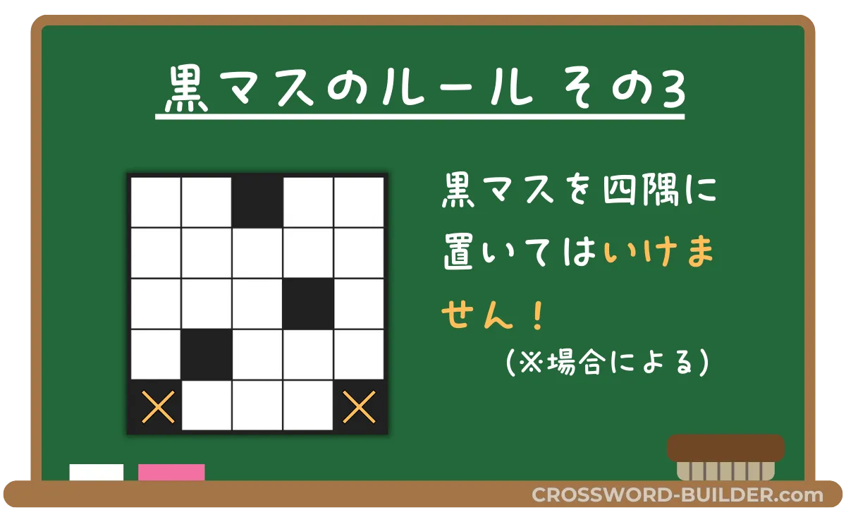 また黒マスをシンメトリー(対称形)に配置する、投稿のサイズは「11 × 11」「15 × 25」を基本とするなどのガイドラインがあります。