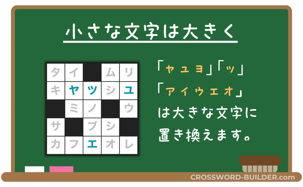 拗音と促音「ヤユヨ・ツ・アイウエオ」は大きな文字に置き換えます。